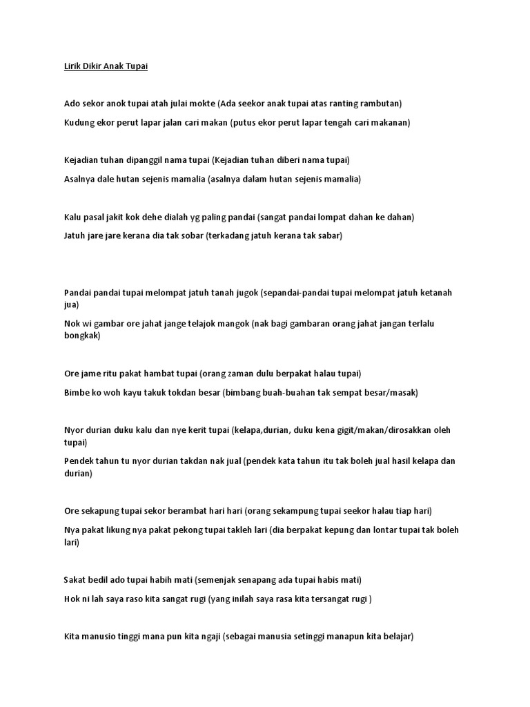 Ado sekor anok tupai atah julai mokte. Mesej pertama yang ingin disampaikan dalam lagu ini ialah ingatan kepada masyarakat supaya jangan terlalu bertindak mengikut hawa nafsu. More Documents from Adalric Escirre Jose Sanz.